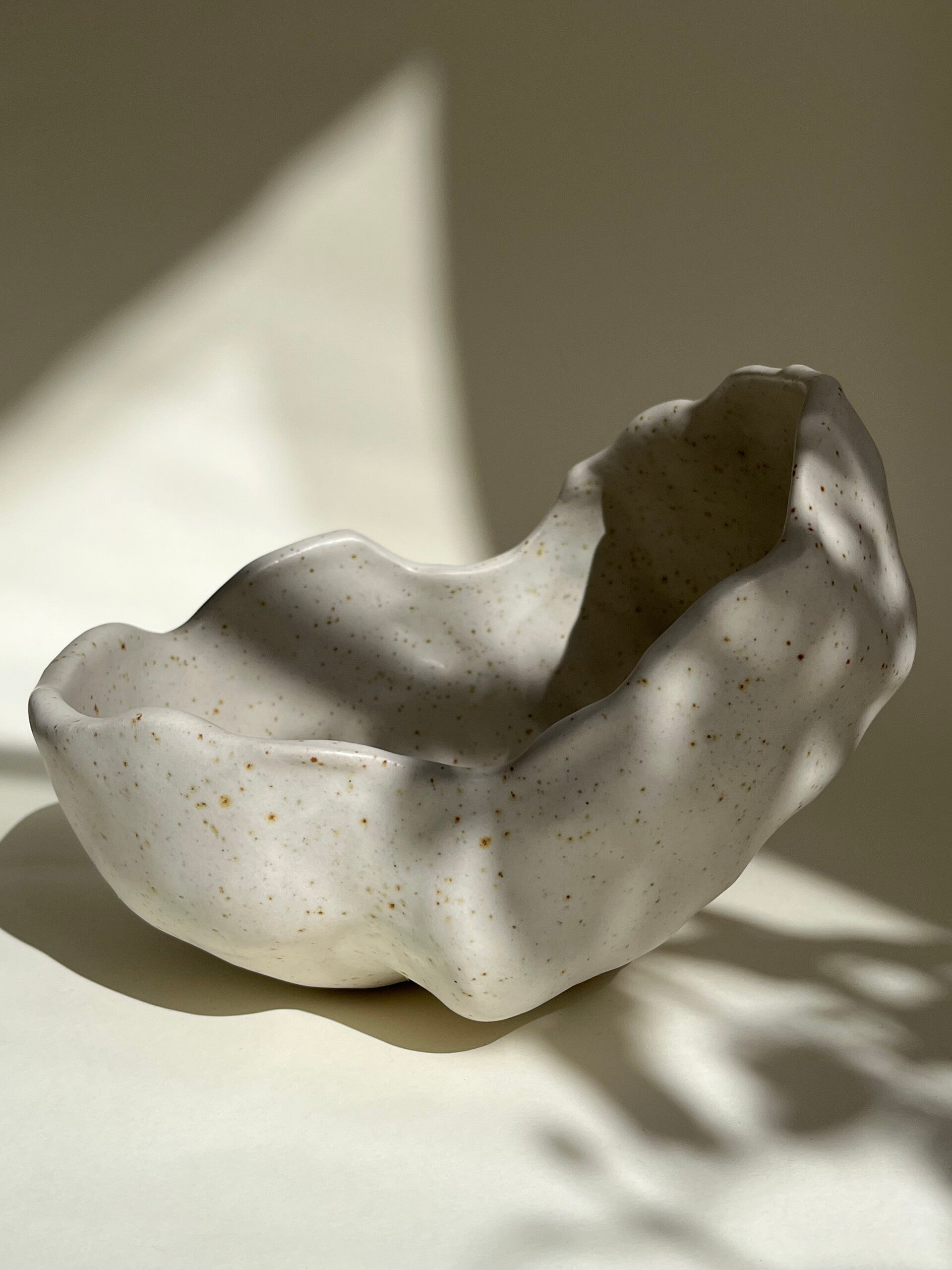 Denna skålen är gjord i en vit lera med lavafläckar.