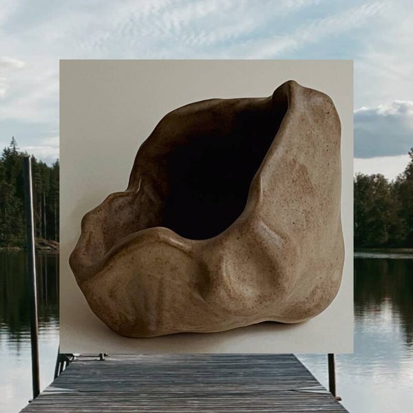 Den här skålen är gjord i en gul lera. Ytan är slät.